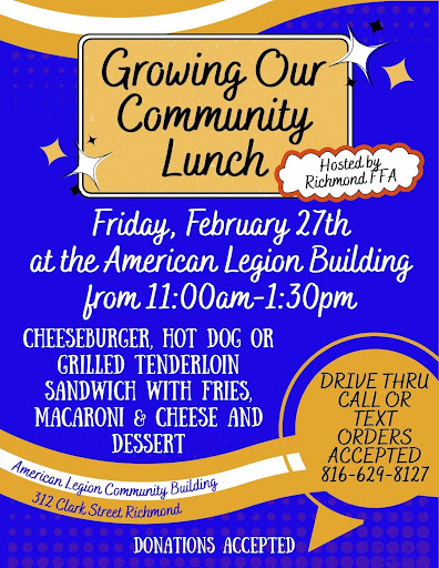 You’re Invited to a “Growing Our Community” Lunch on Friday, February 27th to celebrate National FFA Week! FFA students hope to see you all there. They will be serving cheeseburgers, hot dogs and grilled tenderloin sandwiches! Drive thru, call or text your order and they will have it ready for you.