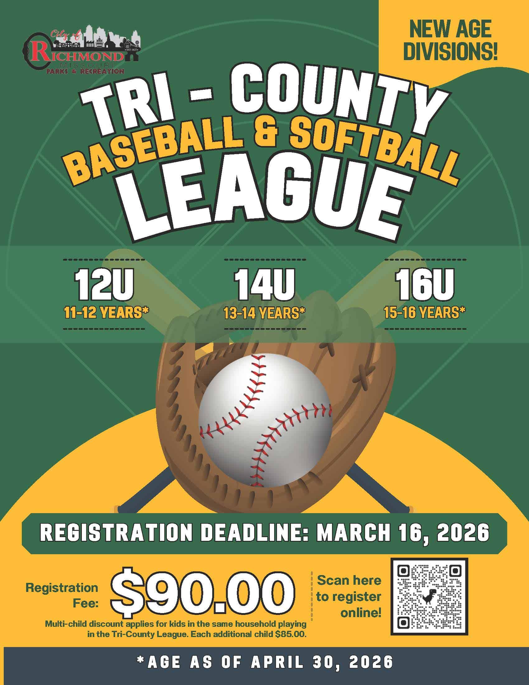 Tri-County Baseball & Softball League Sign up for Tri-County Baseball and Softball League before the registration deadline on March 16th! Sign up online: https://richmondmo.myrec.com/…/program_details.aspx… + Add to Google Calendar + iCal / Outlook export Date Mar 16 2026 Expired! Time All Day Category Community Event Share this event