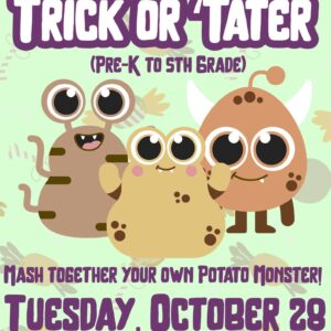 Join us Tuesday, October 28 from 4 to 4:45 pm for Kid Zone STEM: Trick or ‘Tater! Make and take home your own potato monster! All supplies provided. This program is best for kids in preschool through 5th grade.